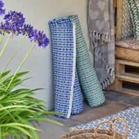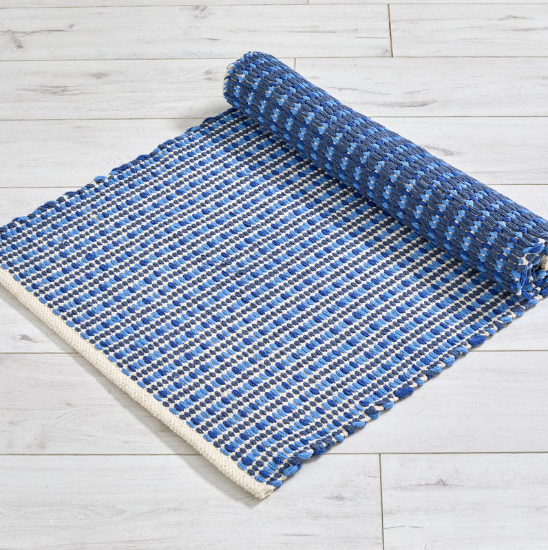 Indulge in luxury with our Capri Rug in stunning tones of blue. Made with high-quality cotton and elegantly rolled and tied with cotton tape, this rug adds a touch of sophistication to any space. Elevate your home with this exclusive, artistic piece.