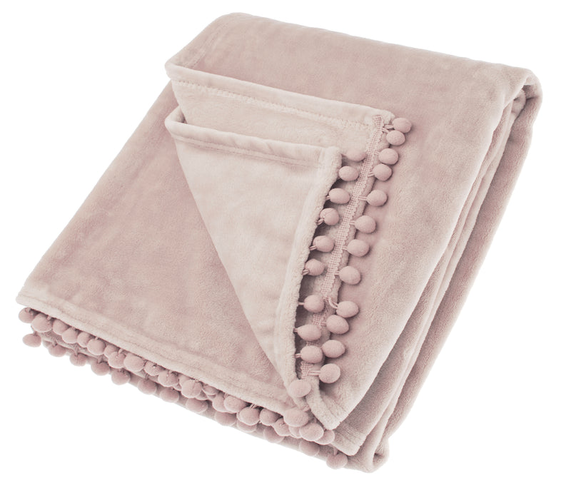 This super soft flannel fleece throw in a soft quartz pink colour, has a pretty pom-pom braid edge at the shortest ends. Perfect as an accent piece at the end of a bed or to snuggle up with on the sofa. Available in a range of seasonal colours.