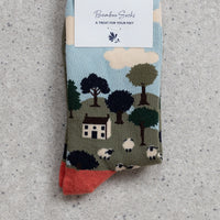 A little box of loveliness, perfect for gifting! Including a pair of super soft bamboo socks woven in our Country Scene print and an adorable cow with daisy keyring. The perfect fun, feelgood gift!