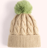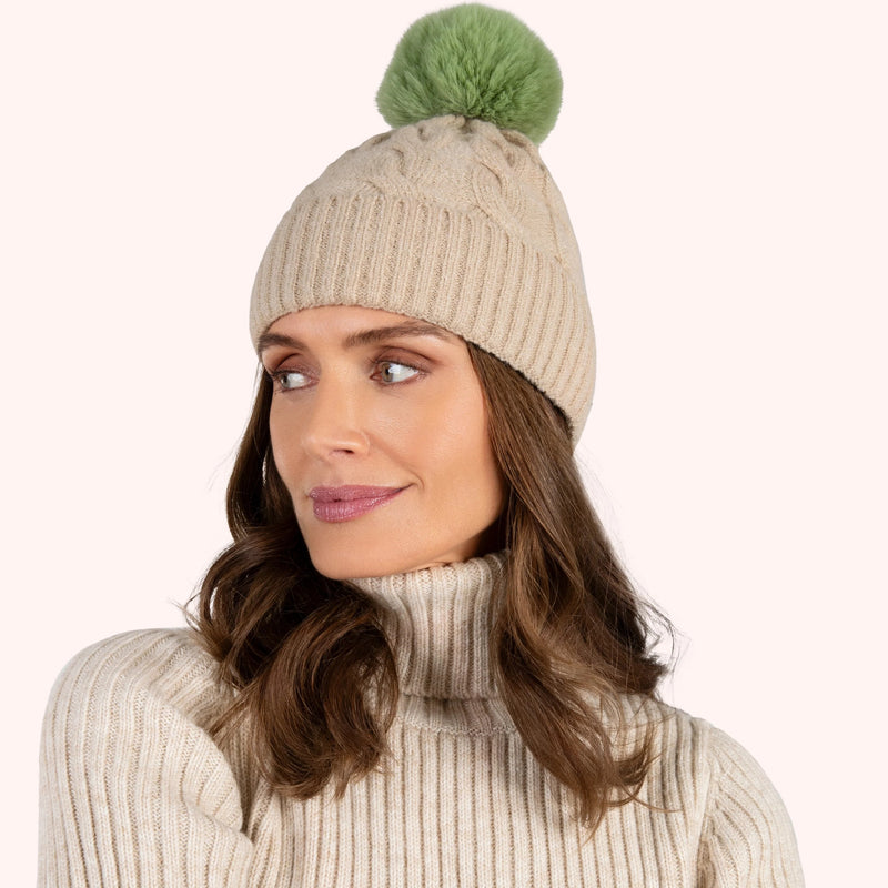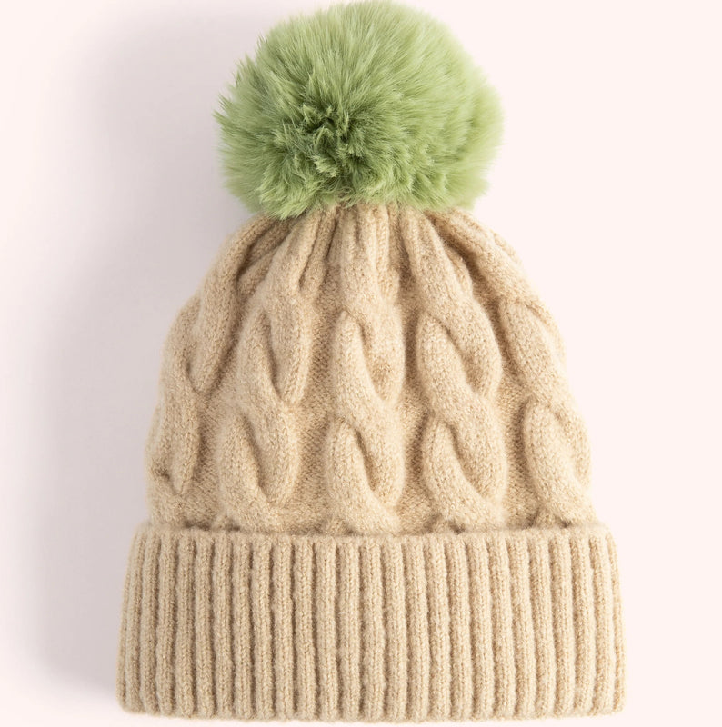 The chunky braid style knit of this Elise Hat is classic with a preppy edge. Creamy vanilla tones combine with a soft sage faux fur pompom for a look that is perfect for someone who gravitates towards neutral earth tones.
