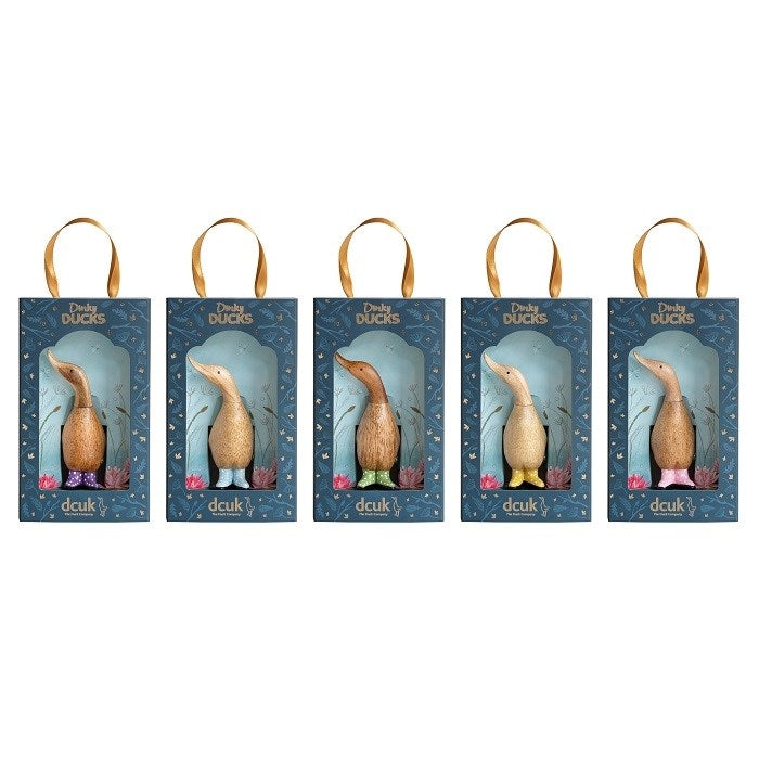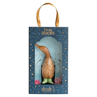 Delightfully dinky and ready for rain, our DCUK Dinky Ducks in green spotty boots don’t want to miss out on those lovely puddles! Carved from bamboo root and painted by hand, naturally.