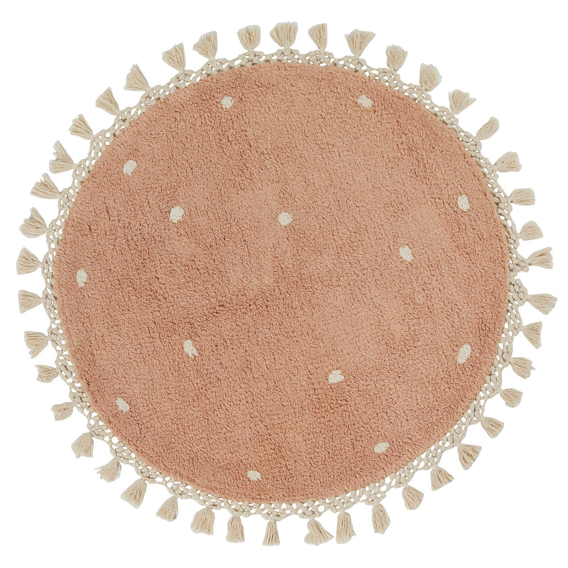 Our newest cotton, circular rug features a dotty design in a pretty blush pink. Finished with a co-ordinating tasselled trim, this would create a beautiful finishing touch to any room in your home. Made from 100% cotton, it's also practical to wash and maintain.