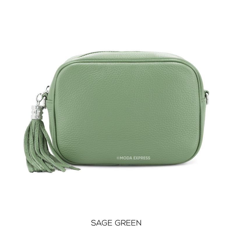 Treat yourself or a loved one to this stylish Italian leather cross body handbag in sage green. This handy accessory is perfect for carrying your everyday essentials, leaving you hands free. Finished with a matching leather tassel, an internal pocket and an adjustable strap.