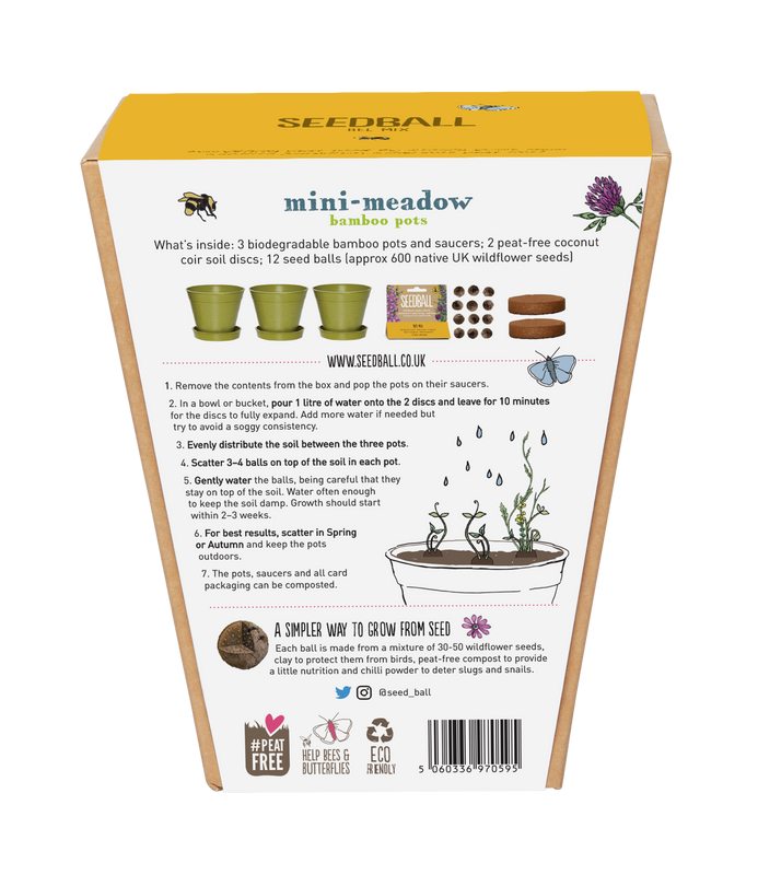 Once set up, mini-meadow bamboo pots are best positioned outdoors, such as on a windowsill or garden table. They can be set up at any time of the year, although early Spring and Autumn are the very best times. All cardboard packaging (including the Seedball packs) are made from 100% recycled card, vegetable inks and they can be safely composted. The coir discs are made from the natural fibres found on the outer shell of coconuts which expand when water is added, turning into a great growing medium for seeds. The sets are available in three varieties: Garden Meadow, Bee Mix and Butterfly Mix, and include full instructions of how to use on the back of the box.