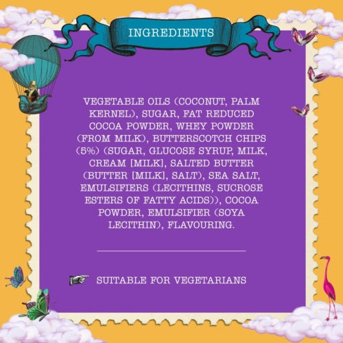 Ingredients include: sugar, fat reduced cocoa powder vegetable oils (coconut palm kernel), skimmed milk powder, cocoa mass, vegetable oils, glucose syrup, salted butter. May contain traces of barley, eggs, nuts sesame and wheat. For detailed information on the ingredients please see label image.
