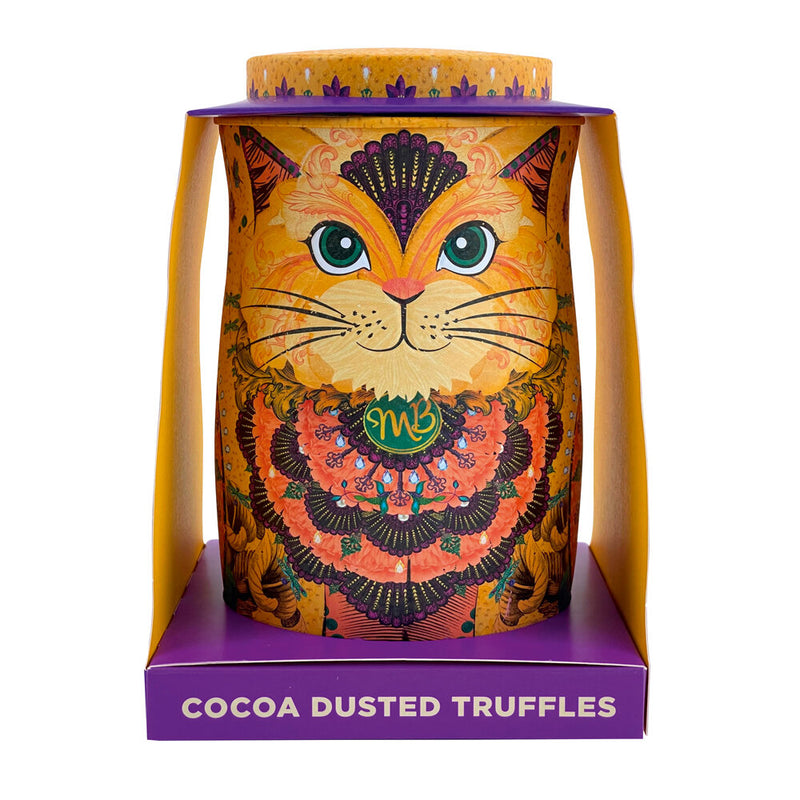 Curiously moreish, these delicious truffles are packaged in a collectable tin with a uniquely designed, beautiful and fantastical cat, "Savannah Gold". Finished with a ‘snowflake’ soft textured varnish