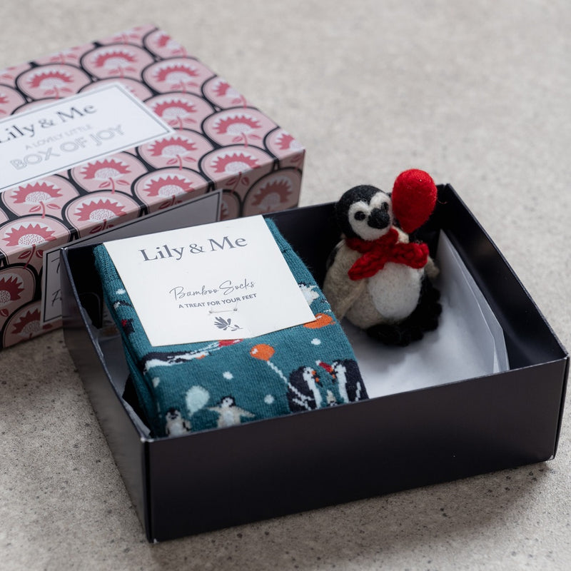 A little box of loveliness, perfect for gifting! Including a pair of super soft bamboo socks woven in a party penguin print and an adorable penguin with scarf and balloon keyring. The perfect fun, feelgood gift!