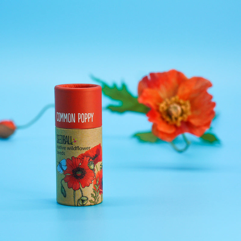 A tube bursting with common poppy seeds. A bright red flowering annual – this hugely popular native wildflower is fantastic for pollinators and garden birds and a stunning addition to any wildflower garden. Poppies are also a big favourite of ours for window boxes or for other small growing spaces.