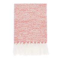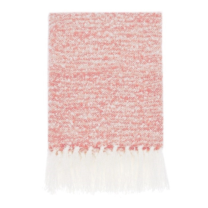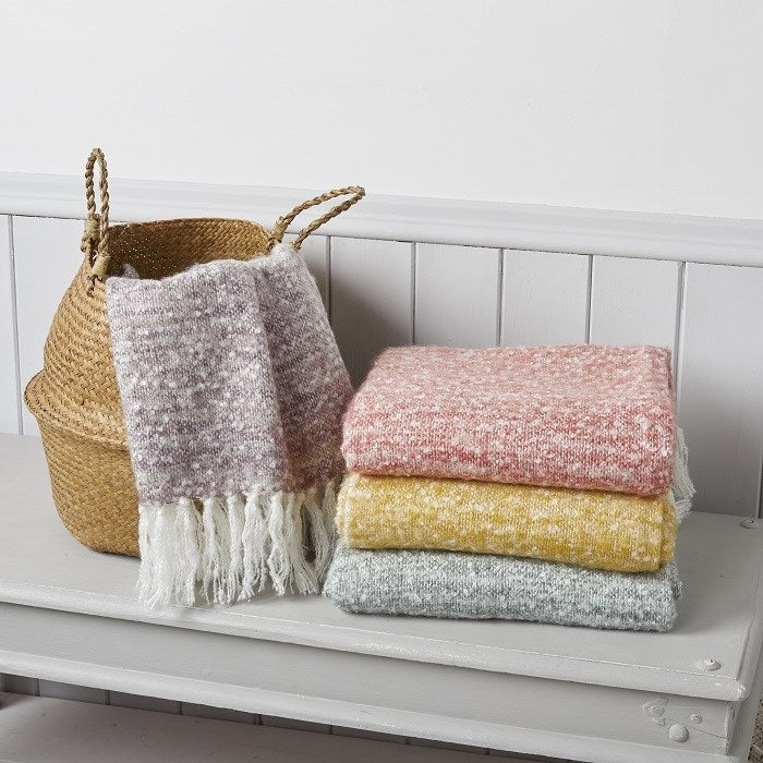 This super soft throw is knitted with space dyed yarns in soft shades of pink and porcelain, creating a boucle effect. Finished with knotted tassels on the shorter ends. Also available in blue de mer and ochre.