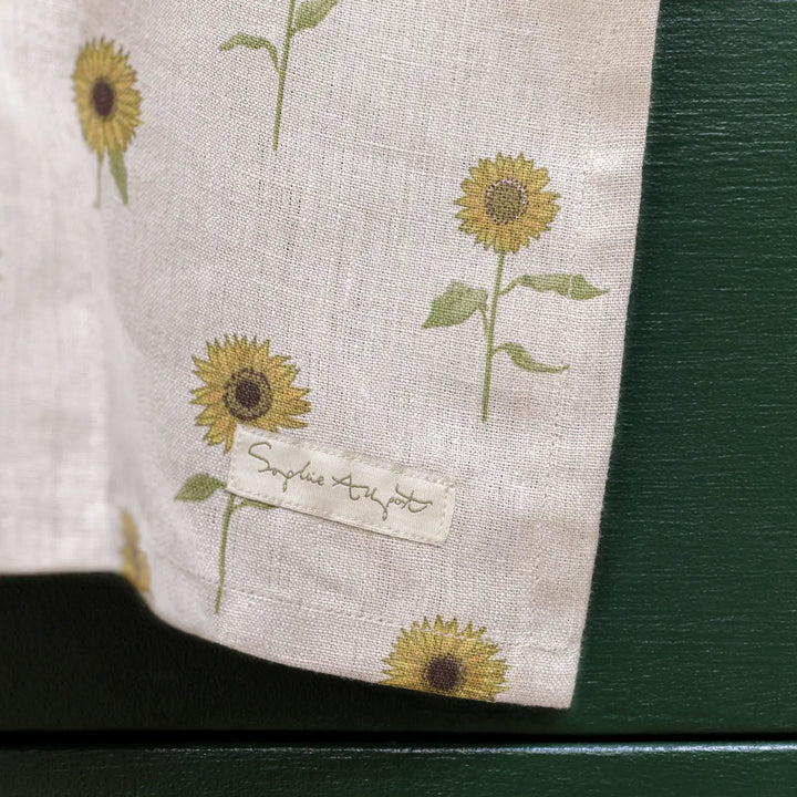 Add charm and warmth to your kitchen with this 100% linen sunflower tea towel, which is sure to make the drying up more enjoyable. Featuring Sophie's bright and cheerful sunflower illustrations with long elegant stems and soft yellow petals on a rustic neutral background, this tea towel will add a stylish touch to your kitchen and would make a lovely gift for any gardening enthusiast!